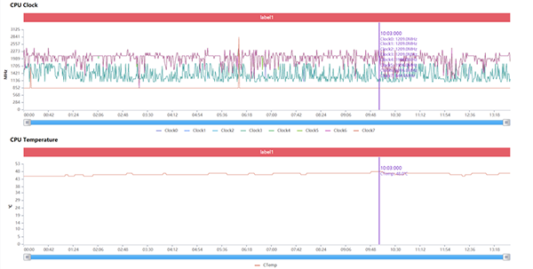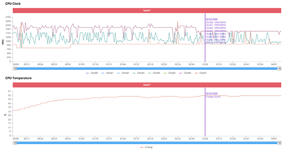 而X1大核依舊是處于離線的狀態(tài),當(dāng)核心達(dá)到55°C時(shí),A78大核的頻率也會(huì)從2.2GHz降到1.8GHz左右,幀率也因此會(huì)從55幀降到約50幀,不過(guò)這對(duì)游戲操作影響不大,且此后溫度能一直保持穩(wěn)定,對(duì)于這樣的高負(fù)載游戲來(lái)說(shuō)可以理解。游戲中平均功耗10W左右,峰值功耗達(dá)到12.5W。
