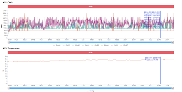 可以看到,在和平精英的CPU調(diào)度情況和王者榮耀類似,X1大核幾乎不調(diào)用,A78大核頻率1.7GHz,另外GPU頻率降低至300MHz左右,整機(jī)功耗平均4.2W,處理器最高溫度45°C。