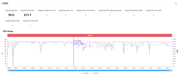觀察游戲中的性能調(diào)度情況,可以看到Find X3 Pro在該應(yīng)用中會(huì)優(yōu)先保證GPU的性能釋放,Adreno 660 GPU幾乎全程保持840MHz的滿頻運(yùn)行。