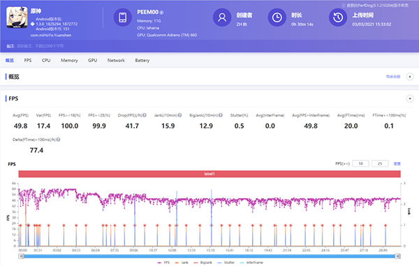 這款游戲更偏重于CPU負(fù)載,在最高畫(huà)質(zhì)60幀璃月港不間斷跑圖30分鐘的測(cè)試?yán)?,F(xiàn)ind X3 Pro最終取得49.8幀的平均幀,表現(xiàn)穩(wěn)定,機(jī)身最高溫度43.4°C。