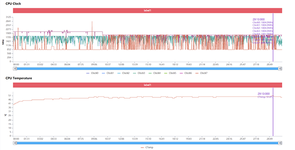 在游戲一開(kāi)始,3個(gè)A78大核可以穩(wěn)定在2.2GHz左右,當(dāng)游戲持續(xù)到接近10分鐘,核心溫度來(lái)到50°C之后,頻率會(huì)降到1.8GHz,此時(shí)游戲幀率同樣被精準(zhǔn)地鎖定在50幀左右,讓畫(huà)面保持穩(wěn)定流暢,這顯然是對(duì)游戲進(jìn)行過(guò)性能與功耗的平衡優(yōu)化。GPU則是持續(xù)運(yùn)行在400MHz左右,整機(jī)平均功耗5.86W,峰值功耗7.28W。