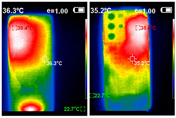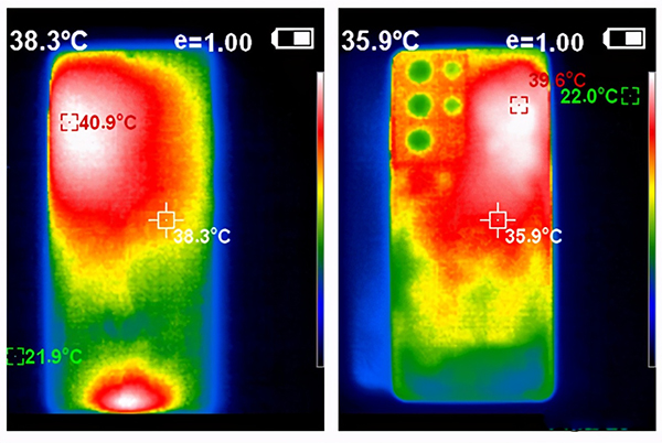 來(lái)看看大家關(guān)心的發(fā)熱問題,在《和平精英》高清HDR+極限幀率模式下,將近半小時(shí)游戲正面溫度最高40.9℃,背面39.6℃。