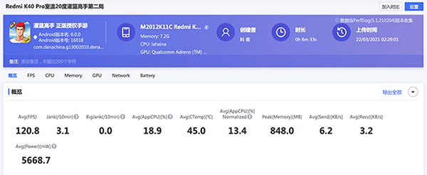 數(shù)據(jù)顯示,Redmi K40 Pro在游戲的比賽期間,平均幀率達到120.8 FPS,幀率相當穩(wěn)定。平均每10分鐘測量一次手機背面溫度,峰值為45.2℃,半小時共掉電20%。