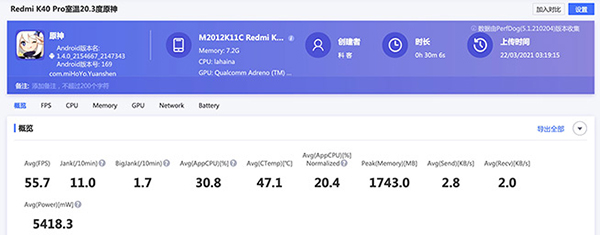 鑒于各大廠商其實都對大熱的《和平精英》、《王者榮耀》手游已經(jīng)優(yōu)化得很好了,基本比較難看出驍龍888機型之間的差距,評測人員選擇了《原神》和《灌籃高手正版手游》,配合手機內(nèi)置的Game Turbo來考驗Redmi K40 Pro(8GB+256GB)的性能表現(xiàn)。