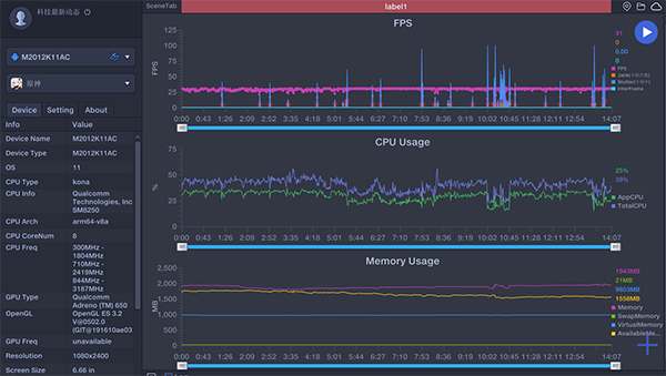 下圖為在高幀率下,運(yùn)行和平精英游戲檢測到的Redmi K40游戲幀率,還有CPU和運(yùn)存的使用情況,基本平均都能接近60幀,CPU和運(yùn)存的負(fù)荷也不是很大,游戲非常的平穩(wěn),而且因為該機(jī)的屏幕支持360Hz觸控采樣率,感覺特別的爽。