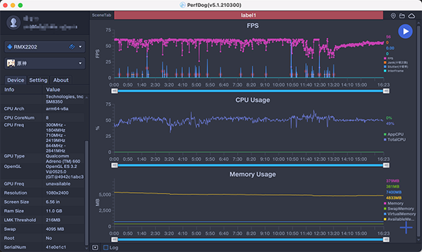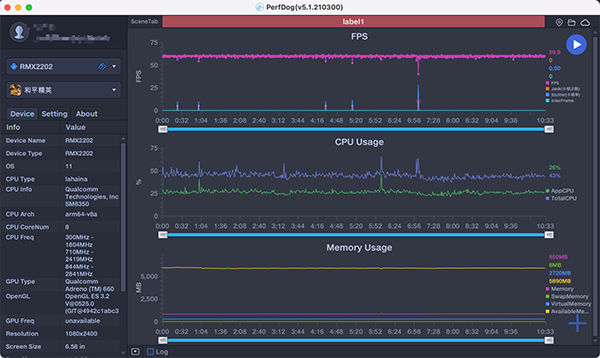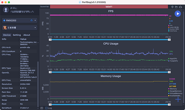 在游戲過(guò)程中,我們通過(guò)騰訊官方幀率測(cè)試軟件perfDog對(duì)游戲幀率進(jìn)行了測(cè)試,可以看到,在近30分鐘的時(shí)間里,realme真我GT的平均幀率始終保持在90幀滿幀狀態(tài),從平穩(wěn)的幀率曲線便不難發(fā)現(xiàn),游戲時(shí)并沒(méi)有出現(xiàn)畫面卡頓或幀率波動(dòng)的情況,看來(lái)90幀王者榮耀對(duì)realme 真我GT來(lái)說(shuō)可以說(shuō)是輕松運(yùn)行無(wú)壓力。