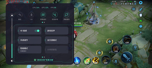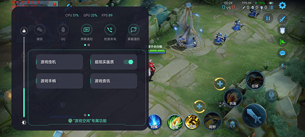 在游戲過(guò)程中,我們可以從屏幕左上角劃出游戲空間專屬功能,可以實(shí)現(xiàn)對(duì)運(yùn)行內(nèi)存的智能分配和手機(jī)性能的動(dòng)態(tài)調(diào)節(jié)。此外,我們也可以在這里開(kāi)啟勿擾模式屏蔽通知,或者通過(guò)超現(xiàn)實(shí)畫質(zhì)增強(qiáng)游戲視覺(jué)體驗(yàn),總之功能還是挺齊全的。