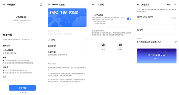 在持續(xù)摸索realme UI的功能時(shí),筆者還發(fā)現(xiàn)一個(gè)好玩的事情,即在realme真我在系統(tǒng)里內(nèi)置了個(gè)『realme實(shí)驗(yàn)室』,而在這里面能夠看到線上用戶喜聞樂見的「DC調(diào)光」和能夠讓筆者更好入睡的「入眠膠囊」等等。對于DC調(diào)光,時(shí)常逛社交媒體的朋友肯定不會陌生。有了它的存在,當(dāng)屏幕亮度低到一定程度時(shí),可以有效地降低頻閃,從而減輕屏幕對眼睛的刺激,變相的保護(hù)了眼睛。但DC調(diào)光自然也有著不利的一面,即開啟后可能會造成局部顯示異常和自動(dòng)亮度調(diào)節(jié)異常等等,可能也是因?yàn)檫@個(gè)的原因,realme才會將DC調(diào)光放在實(shí)驗(yàn)室里面吧。但有一說一,對比現(xiàn)在很多不帶DC調(diào)光的旗艦機(jī),realme真我GT的這一點(diǎn)筆者舉雙手支持!