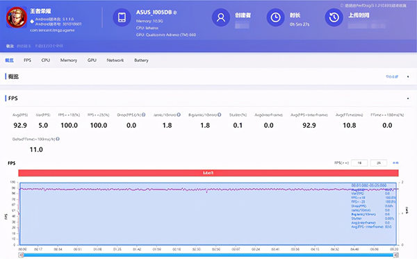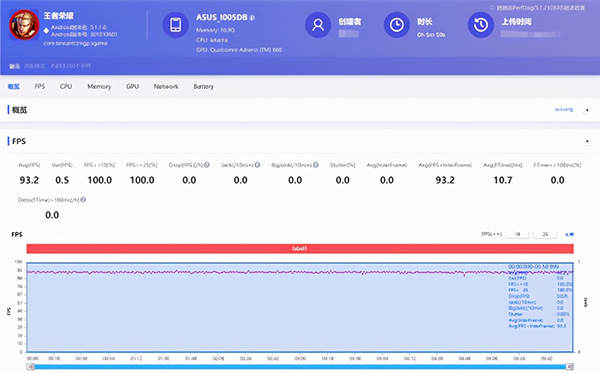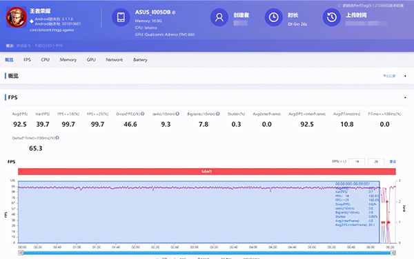 刨除開局前后的幀率波動,將三盤的幀率進行一個簡單的平均,92.8的游戲平均幀率在王者榮耀的最高畫質(zhì)中可謂是一個頂級的成績,曲線的平滑程度也絕對讓用戶折服。