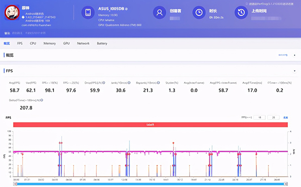 既然《和平精英》無法壓榨手機的最后一滴血,那就別怪我們手下留情了,祭出地表手游性能榨汁機《原神》,將其設(shè)置為最高畫質(zhì),進行30分鐘的游戲測試。在《原神》中,騰訊ROG游戲手機5的真正性展現(xiàn)無疑:平均幀率58.7 fps,軟件測得的CPU全程平均溫度為51.9℃。