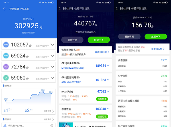 很多人都覺得千元機的性能不重要,這其實是錯誤的,千元機也要有等同價位的性能。realme真我V11搭載的是天璣700處理器,基于7nm制程工藝打造,最高主頻為2.2GHz,在千元機里算上比較好的了。只看參數(shù)不夠直觀,我們直接上安兔兔,realme V11得分為30萬分,表現(xiàn)可以說是中規(guī)中矩。