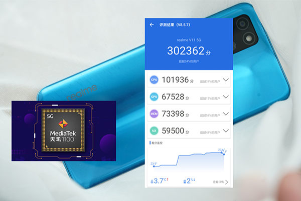 不服,就跑個(gè)分吧,在基準(zhǔn)測試軟件安兔兔上realme真我V11地達(dá)到了302362分,其中CPU得分101936分、GPU得分67528分,這個(gè)成績跟旗艦機(jī)比不了,但是也非常的優(yōu)秀了,滿足日常使用沒有問題。