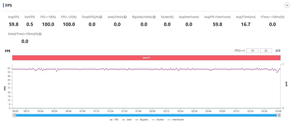 《原神》是目前最考驗設(shè)備絕對性能的游戲之一,在畫質(zhì)選項全最高的情況下,黑鯊4 Pro平均幀數(shù)為59.9,這個幀數(shù)是在世界地圖的場景下有跑動,打野怪的操作,中間的掉幀情況有可能是因打開了裝備菜單,整體的穩(wěn)定性還是不錯的,沒有大波動。