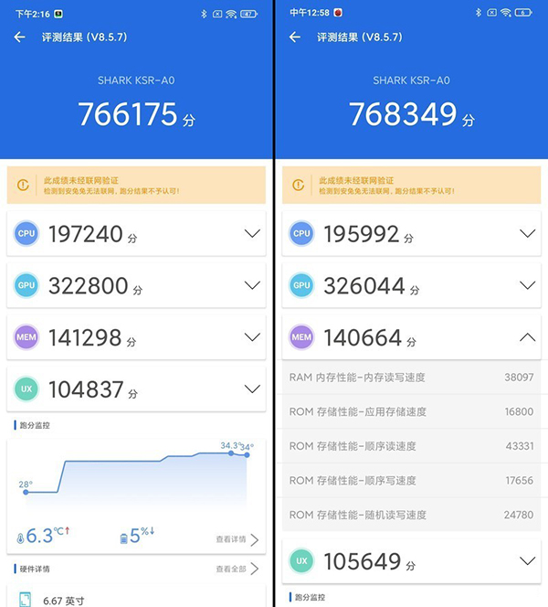 由于UFS+SSD磁盤(pán)陣列技術(shù)的加持,黑鯊4 Pro的性能相比其他驍龍888手機(jī)明顯高一些,安兔兔跑分達(dá)到了76.8萬(wàn)分,其中MEM子項(xiàng)的分?jǐn)?shù)明顯比其他驍龍888手機(jī)高,這都是ROM存儲(chǔ)性能立功了。