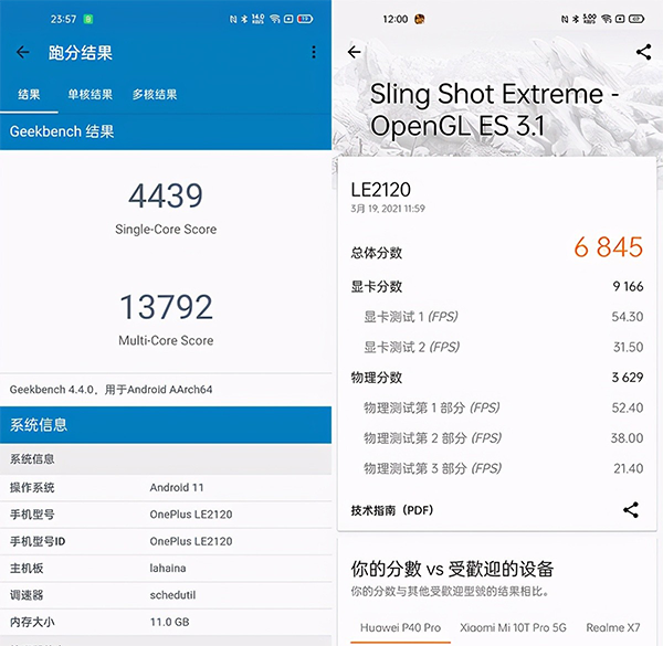 在Geekbench4跑分中,一加9 Pro單核跑分為4439分,多核跑分達(dá)13792分,CPU部分性能表現(xiàn)出色,代表這款手機(jī)在運(yùn)行時(shí)有著非常高的處理效率。在3DMark跑分中,這款手機(jī)OpenGLES3.1分?jǐn)?shù)為6845分,3D性能表現(xiàn)優(yōu)秀,加之高通驍龍888針對(duì)游戲的優(yōu)化,使得這款手機(jī)在玩游戲時(shí),能消費(fèi)者提供精致細(xì)膩的游戲畫面。