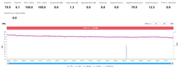 最高畫質(zhì)游玩《王者榮耀》,一加9 Pro始終沒能達(dá)到90FPS的滿幀,不過幀率穩(wěn)定度不錯,平均幀率為79.9FPS。