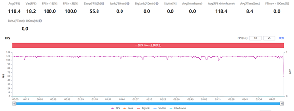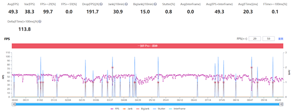 一加9 Pro在《原神》中的表現(xiàn)較為糟糕,卡頓出現(xiàn)的較為頻繁,可以看到后半段的波動尤為頻繁。
