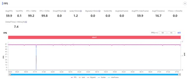 《和平精英》選擇「HDR高清+極限幀率+抗鋸齒開(kāi)+陰影開(kāi)」畫(huà)質(zhì),單局23+分鐘游戲幀率記錄如上。可以看到雖然在剛槍和快速移動(dòng)場(chǎng)景有著一定的波動(dòng),但整體幀率較高,平均幀率達(dá)到了59.3FPS,幀率≥45FPS時(shí)間占比達(dá)到99.8%,全程幀率100%維持在30FPS以上,同樣相對(duì)流暢。當(dāng)然,如果是日常游戲而不是測(cè)試的話,推薦畫(huà)質(zhì)可以降至高清,幀率會(huì)更加穩(wěn)定。