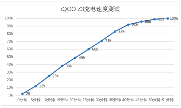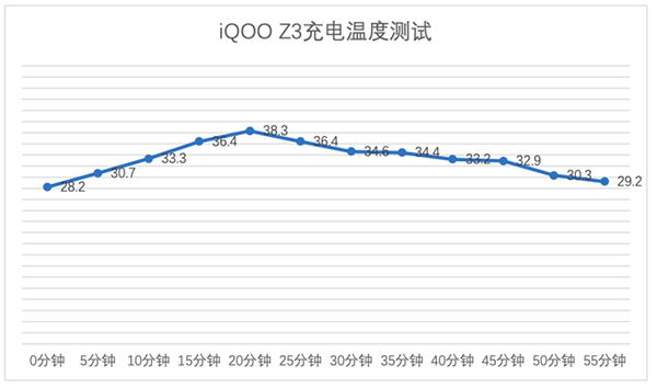 手機靜置到溫度和室溫差不多后2%開始滅屏充電,實測15分鐘之后充進的電量為38%,30分鐘為71%,到了51分鐘左右差不多就充滿了。而在充電期間的溫度也控制得很不錯,溫度20分鐘后上升38℃左右,然后就開始下降,整個過程沒有明顯燙手的情況。