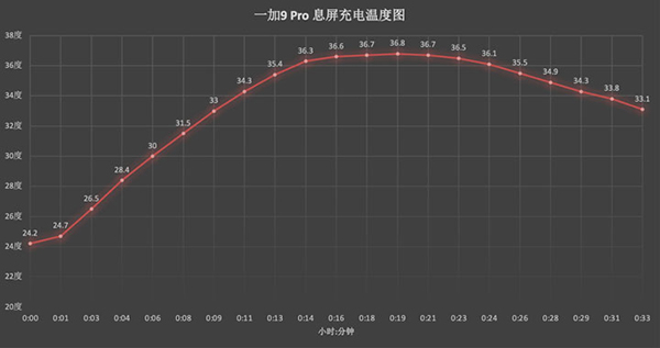 充電溫度方面,一加9 Pro息屏峰值充電溫度36.8攝氏度,結(jié)束充電時(shí)溫度為33.1攝氏度。