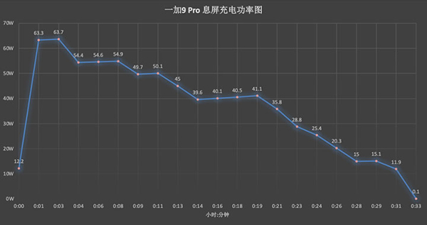 充電功率方面,一加9 Pro在1分鐘內(nèi)就達(dá)到了63.3W左右功率,峰值功率63.7W,隨后呈階梯狀遞減,最終在第33分鐘衰減至0.1W。
