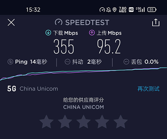 我們選用專業(yè)網速測試軟件,選用默認連接節(jié)點,測試5G網絡條件下一加9 Pro的傳輸速度。實測其在5G網絡下可以達到下行355Mbps,上行95.2Mbps,抖動2ms的水準。