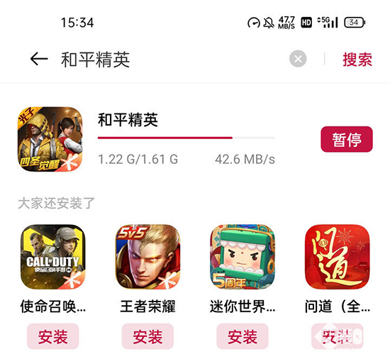 隨后,我們打開應用商店,測試在5G網絡下下載大型應用游戲的速度。5G網絡下,一加9 Pro峰值下載速度可達47.7MB/s,體現出了5G網絡在下載時的巨大優(yōu)勢。