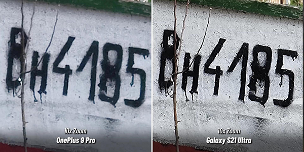 首先來一張鏡頭變焦10倍之后的照片對(duì)比,從相片上來看,一加9 Pro和三星S21 Ultra之間,對(duì)于建筑物外表面上的字體的清晰程度表現(xiàn)還是有著非常明顯的區(qū)別。比如一加9 Pro拍攝的照片中,建筑物表面的字體銳利度不夠,字體和建筑物表面之間稍微比較模糊。三星S21 Ultra拍攝的照片中,黑色的字體表面比較銳利,在建筑物表面顯示比較清晰。