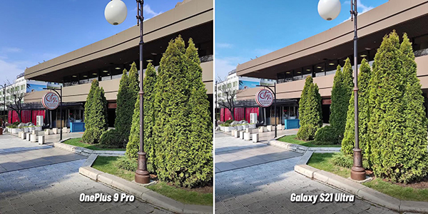 第二組照片拍攝的環(huán)境是在室外,而且拍照的環(huán)境中有著明暗不同的光線照射狀態(tài)。比如說照片中右側(cè)區(qū)域的松樹,光線照射在上面,一加9 Pro和三星S21 Ultra拍攝的曝光度就完全不同。三星S21 Ultra拍攝的照片中松樹的亮度較高,而一加9 Pro拍攝的照片中的松樹亮度則較低。另外在松樹背面的建筑物表面的色彩方面,一加9 Pro拍攝的照片中建筑物表面顏色比較深,而三星S21 Ultra拍攝的建筑物表面顏色較淺。