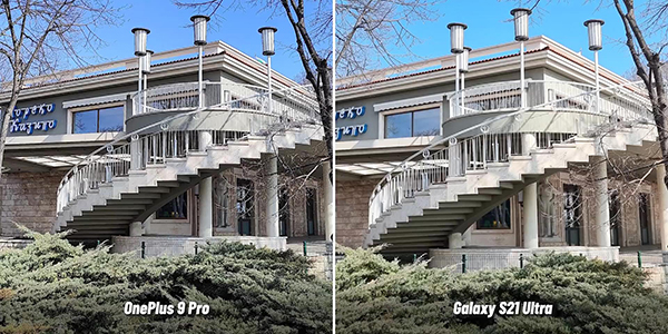 第三組照片效果的對(duì)比,讓我們仔細(xì)來看下一加9 Pro和三星S21 Ultra之間的區(qū)別。首先我們先看下一加9 Pro和三星S21 Ultra之間在天空中色彩的表現(xiàn),比較明顯的是一加9 Pro拍攝的天空顯然要比三星S21 Ultra的天空顏色更藍(lán)。另外在樓梯部分的表現(xiàn),一加9 Pro的曝光度稍低一些,而三星S21 Ultra的曝光度則稍微高一些。