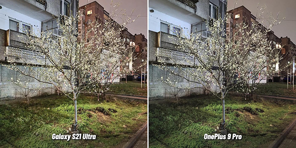 第四組照片是夜景拍照的對(duì)比,值得注意的是三星S21 Ultra和一加9 Pro的照片互相更換了位置。先看照片的亮度,三星S21 Ultra拍攝的照片亮度最高,因?yàn)檎掌路降牟莸乇砻娴牧炼缺容^高,光線比較充足。一加9 Pro拍攝的照片中的地面草地亮度,則看起來暗了很多。其次是櫻花樹后方的建筑物,三星S21 Ultra的建筑物表面亮度也依然較高,而一加9 Pro的亮度則比較低。