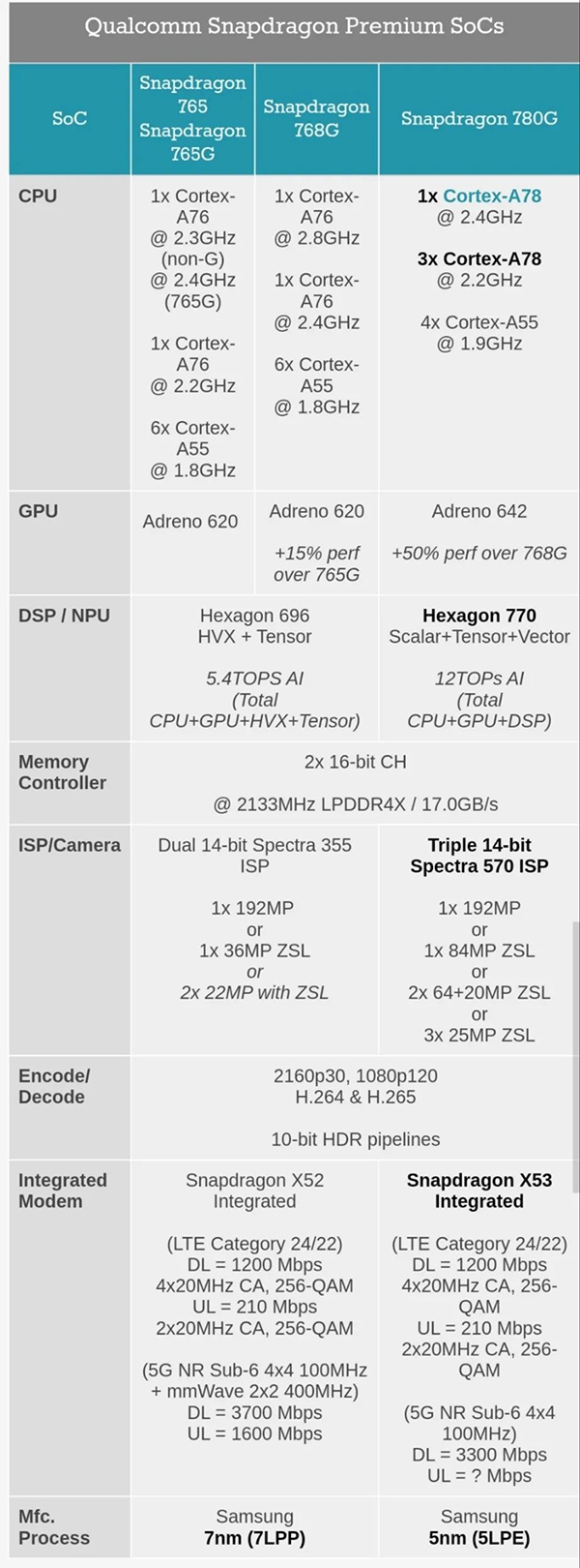 此前不久,高通剛剛發(fā)布了驍龍780G,該處理器基于八核架構,主打低價市場。驍龍780G同為5nm工藝制程,包括一個主頻2.4GHz的Cortex-A78核心,三個主頻2.2GHz的Cortex-A78核心,以及四個主頻1.9GHz的Cortex-A55核心。