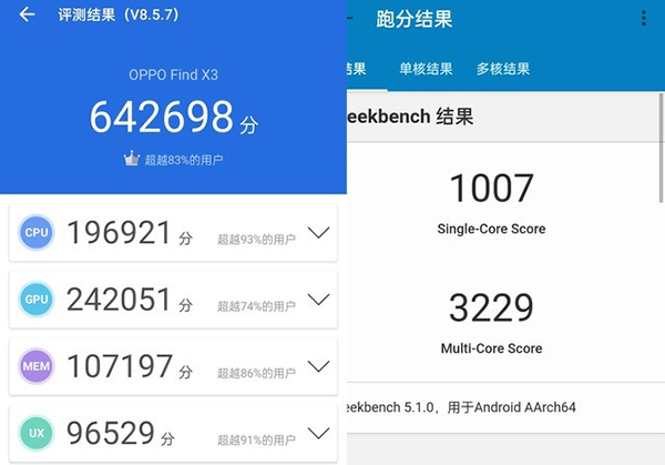 從跑分來看,在室溫22攝氏度的情況下,OPPO Find X3在安兔兔上的跑分可以達到642698分,而在Geekbench 5.1.0上,單核跑分成績也達到了1007,多核跑分成績3229,整體表現(xiàn)也符合我們對驍龍870的期待。