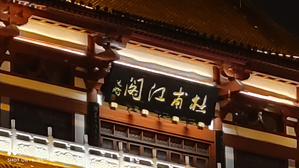 夜景模式下,建筑牌匾上“杜甫江閣”四個(gè)字清晰可見,天空的處理干凈如洗,但細(xì)看樹冠和建筑物邊緣并沒有出現(xiàn)涂抹痕跡。物體暗部依然保留了豐富的細(xì)節(jié),燈光的壓制控制到位。