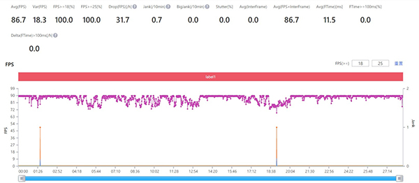 《和平精英》解鎖HDR高清、90幀模式,一局下來(lái)平均可以跑到86.7幀,中間的波動(dòng)主要出現(xiàn)在駕駛載具的場(chǎng)景,不過(guò)波動(dòng)深度相比過(guò)去的驍龍865機(jī)型并不算大,所以幀率波動(dòng)也僅有18.3。