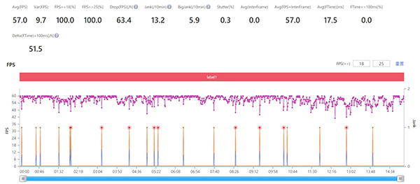《原神》全高畫質(zhì)60幀下15分鐘后平均可以跑到57幀(測(cè)試的場(chǎng)景可能相對(duì)沒(méi)有那么吃性能),幀率波動(dòng)9.7,波動(dòng)更多出現(xiàn)在后期。