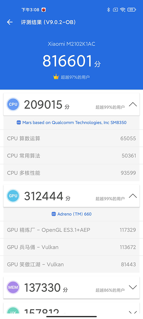 但是因?yàn)檫@次升級(jí)了非常強(qiáng)悍的散熱系統(tǒng)—固液氣三態(tài)立體散熱系統(tǒng),所以大大拔高了驍龍888的性能上限。跑了下安兔兔,分?jǐn)?shù)達(dá)到了驚人的816601分。