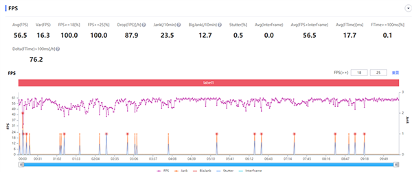 從我們對(duì)小米11 Ultra的幀數(shù)監(jiān)測(cè)來(lái)看,其在一開始的戰(zhàn)斗場(chǎng)景幀率波動(dòng)較為頻繁,其它場(chǎng)景下基本上能夠保持長(zhǎng)時(shí)間滿幀,10分鐘的游戲測(cè)試之后,平均幀率能夠達(dá)到56.5幀,該機(jī)是筆者目前所測(cè)試的安卓手機(jī)當(dāng)中幀數(shù)表現(xiàn)最佳的機(jī)型。