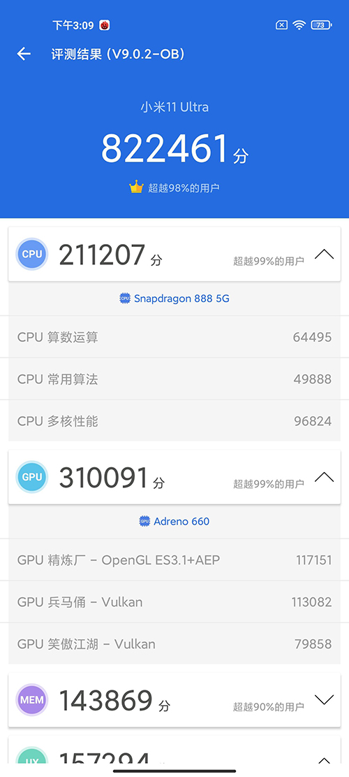 根據(jù)榜單此前收錄的成績,驍龍865機型能夠達到單核心918、多核心3386,小米11Ultra所搭載的驍龍888比之分別提高大約23%、8%,符合正常驍龍888機型的表現(xiàn)。