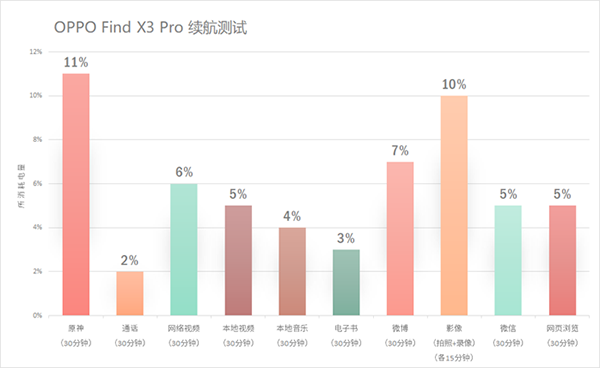 我們先把充滿電的Find X3 Pro做了一套高強(qiáng)度的常規(guī)測試,結(jié)果發(fā)現(xiàn),在亮度50%,聲音50%,連接WIFI的測試場景下。測得Find?X3?Pro30分鐘在線視頻耗電6%,30分鐘原神耗電11%,30分鐘微博耗電7%,30分鐘影像體驗耗電10%,從剩余42%電量的測試結(jié)果來看,F(xiàn)ind X3 Pro折騰了5個小時的續(xù)航測試后依然堅挺。