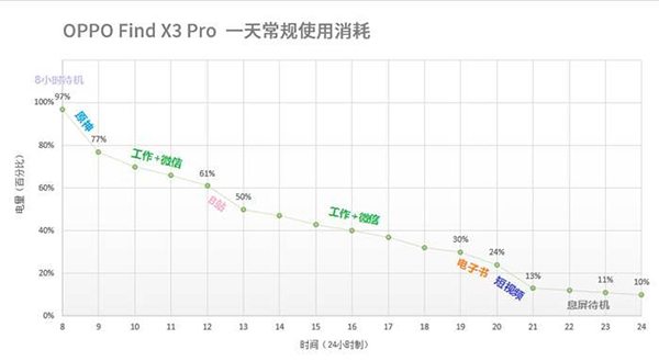 為了保證Find X3 Pro的續(xù)航測試符合日常使用情況,我們還以Find?X3作為主力機(jī)測試模擬一整天的續(xù)航情況。這項測試包含了上班路上1小時原神游戲,下班路上1小時電子書,中午1小時的B站番劇,上班過程中4小時的微信,其余時間的待機(jī)和晚上1小時的短視頻,在最后看完短視頻后,手機(jī)還剩余13%左右的電量,整個測試下來手機(jī)的亮屏?xí)r間將近8小時,完全就是超重度用戶的使用場景,由此可見Find X3 Pro撐足一天的高強(qiáng)度使用是完全沒有問題的。另外即便是電量低了也可以在半小時內(nèi)的滿血復(fù)活,這份成績放在如今的旗艦機(jī)是十分出色的表現(xiàn)。