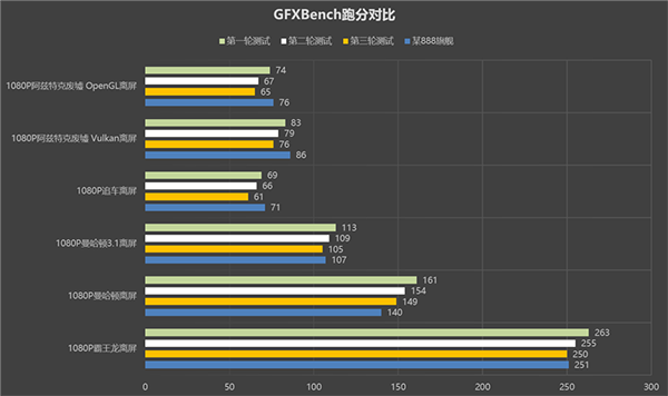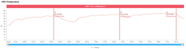 為了測(cè)試新型散熱的效果如何,我們使用負(fù)載最大的GFXbench進(jìn)行了三輪測(cè)試,來看看散熱效果如何。