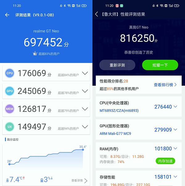 realme真我GT Neo搭載的天璣1200芯片基于臺(tái)積電6納米工藝制造,CPU采用旗艦級(jí)的1+3+4三叢架構(gòu)設(shè)計(jì)。其中超大核Arm Cortex-A78主頻高達(dá)3.0GHz,GPU則為G77 Mali-MC9。在安兔兔V9.0.1版本中,realme GT Neo可以跑出來接近70萬(wàn)分的分?jǐn)?shù),在魯大師也有81萬(wàn)分左右的成績(jī)。
