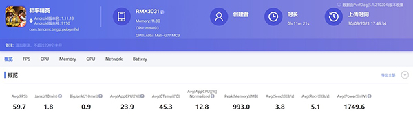 在室溫26度的情況下,和平精英中我們選取60幀下的最高畫質(zhì)測試,在一局吃雞戰(zhàn)役中realme真我GT Neo的平均幀數(shù)達(dá)到了59.7幀,幀數(shù)曲線幾乎拉成一條直線,30分鐘游戲后耗電14%,機(jī)身表面最高溫度40.1度。