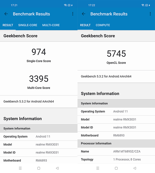 為了更直觀地了解天璣1200旗艦處理器的性能,我們借助Geekbench 5軟件進(jìn)行測試。可以看到這枚SoC芯片在CPU性能測試中獲得了單核974分,多核3395分的成績,在GPU性能測試中更獲得了5745分的高分,相信在各類游戲和圖像渲染軟件中都能如履平地。