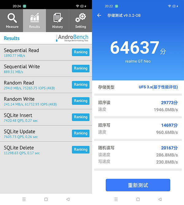 隨后,我們分別借助AndroBench軟件和安兔兔內(nèi)置工具對realme真我GT Neo的存儲(chǔ)性能進(jìn)行了測試,可以看到AndroBench軟件測試到的順序讀取和寫入速度分別為1890.77MB/s和889.51MB/s,而安兔兔內(nèi)置工具測試到的順序讀取和寫入速度分別為1946.42MB/s和960MB/s,兩者的成績基本保持在同一區(qū)間內(nèi)。