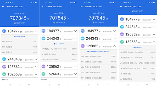 接下來我們借助安兔兔軟件對realme真我GT Neo的整機(jī)性能進(jìn)行了測試,可以看到該機(jī)獲得了707845的總分,成績超越了84%的其他用戶,其中CPU部分的得分尤為出色,達(dá)到184977分,超越了88%的其他用戶。