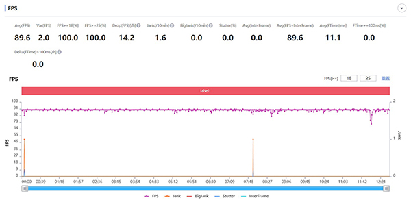 首先登場的是經(jīng)典MOBA手游《王者榮耀》,老規(guī)矩音畫質(zhì)最高特效全開,借助PerfDog軟件,我們看到了游戲運(yùn)行的相關(guān)數(shù)據(jù),游戲平均FPS達(dá)到89.6,F(xiàn)PS波動(dòng)僅為2.0,整個(gè)游戲過程都順滑流暢,實(shí)際表現(xiàn)非常令人滿意。