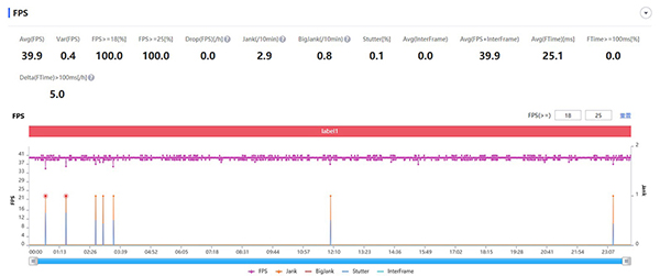 隨后登場的測試游戲是《和平精英》,從PerfDog軟件的測試結(jié)果可以看到,游戲平均幀率穩(wěn)定在39.9左右,F(xiàn)PS波動(dòng)僅為0.4,發(fā)揮非常穩(wěn)定,而穩(wěn)定的幀率對射擊類游戲來說特別重要,畢竟稍有卡頓便有可能導(dǎo)致游戲失敗。