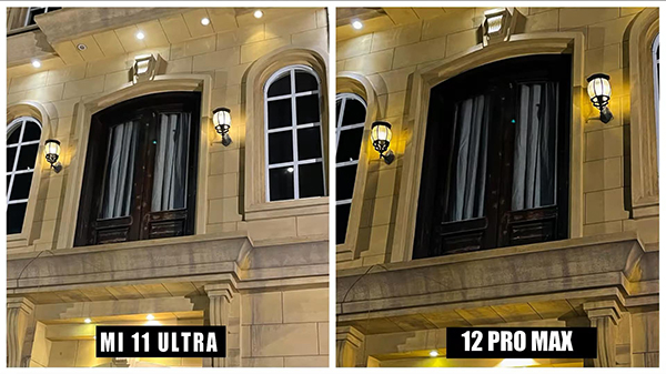 第一組照片的夜景拍攝效果對(duì)比,小米11 Ultra完勝iPhone 12 Pro Max。